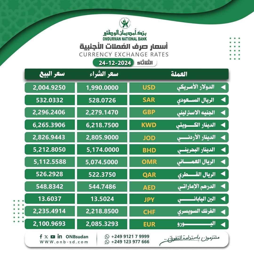 أسعار العملات الأجنبية مقابل الجنيه السوداني من بنك أمدرمان الوطني اليوم الثلاثاء 24 ديسمبر