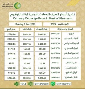 نشرة أسعار الصرف للعملات الأجنبية في بنك الخرطوم ليوم الإثنين، الموافق 6 يناير 2025م
