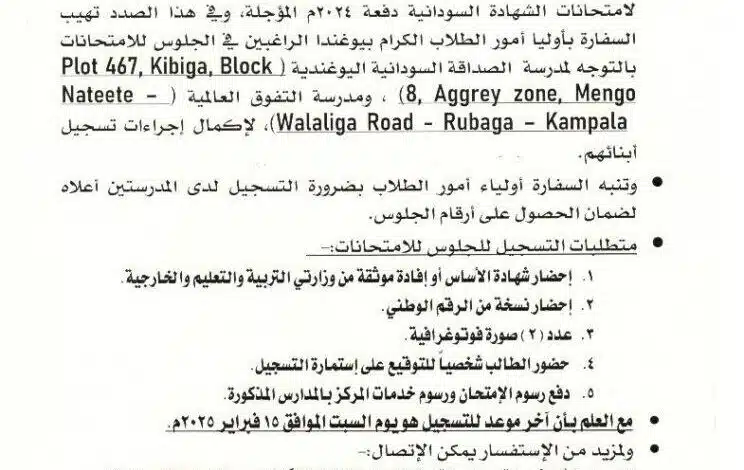 وأشار بيان صادر عن السفارة إلى تخصيص مراكز تسجيل في العاصمة الأوغندية كمبالا، تشمل مدرسة الصداقة السودانية اليوغندية ومدرسة التفوق العالمية، مع تحديد يوم 15 فبراير 2025 كموعد نهائي لإتمام عملية التسجيل.