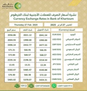 أسعار الصرف للعملات الاجنبية في السودان اليوم الخميس في فبراير 27, 2025 113 0 أسعار الصرف للعملات الاجنبية في السودان اليوم الخميس نشرة أسعار الصرف للعملات الاجنبية في بنك الخرطوم اليوم الخميس، الموافق 27 فبراير 2025م. شارك هذا الموضوع: انقر للمشاركة على فيسبوك (فتح في نافذة جديدة) فيس بوك النقر للمشاركة على X (فتح في نافذة جديدة) X شاركها على آخر خبر السودانأسعار صرف العملات الأجنبيه مقابل الجنيه المصري