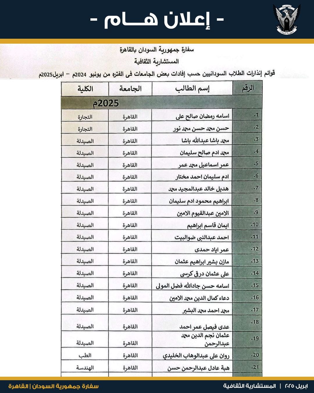 ـ أعلنت سفارة السودان بالقاهرة عن تلقي 100 طالب سوداني في الجامعات المصرية، إنذارا.
