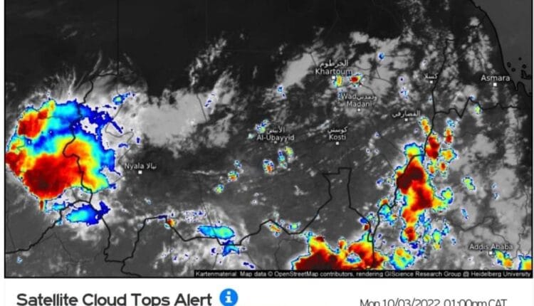 – علي الحدود الشرقية من البلاد تنتشر السحب الركامية علي ولاية كسلا، القضارف، سنار وولاية النيل الأزرق، وعلي الحدود الغربية من البلاد علي ولاية شمال، وسط وغرب دارفور.