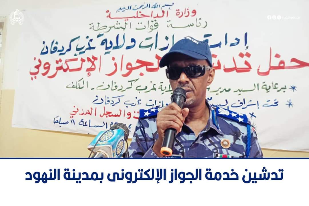 ـ وسط حضور رسمى وشعبى تقدمه أمين عام حكومة الولاية ومدير تنفيذى محلية النهود دشن مدير شرطة ولاية غرب كردفان المكلف العميد شرطة د/ معز عبدالقادر علي محمد إنطلاقة العمل بنافذة إستخراج الجواز الإلكترونى بمدينة النهود وقد عمت الفرحة كافة أطياف المجتمع بشرائحه وفئاته المختلفة بهذا الإنجاز الذى يختصر الكثير من الجهد والمال وعناء السفر طلبا لخدمة إستخراج الجواز الإلكترونى للمواطنين خارج الولاية.